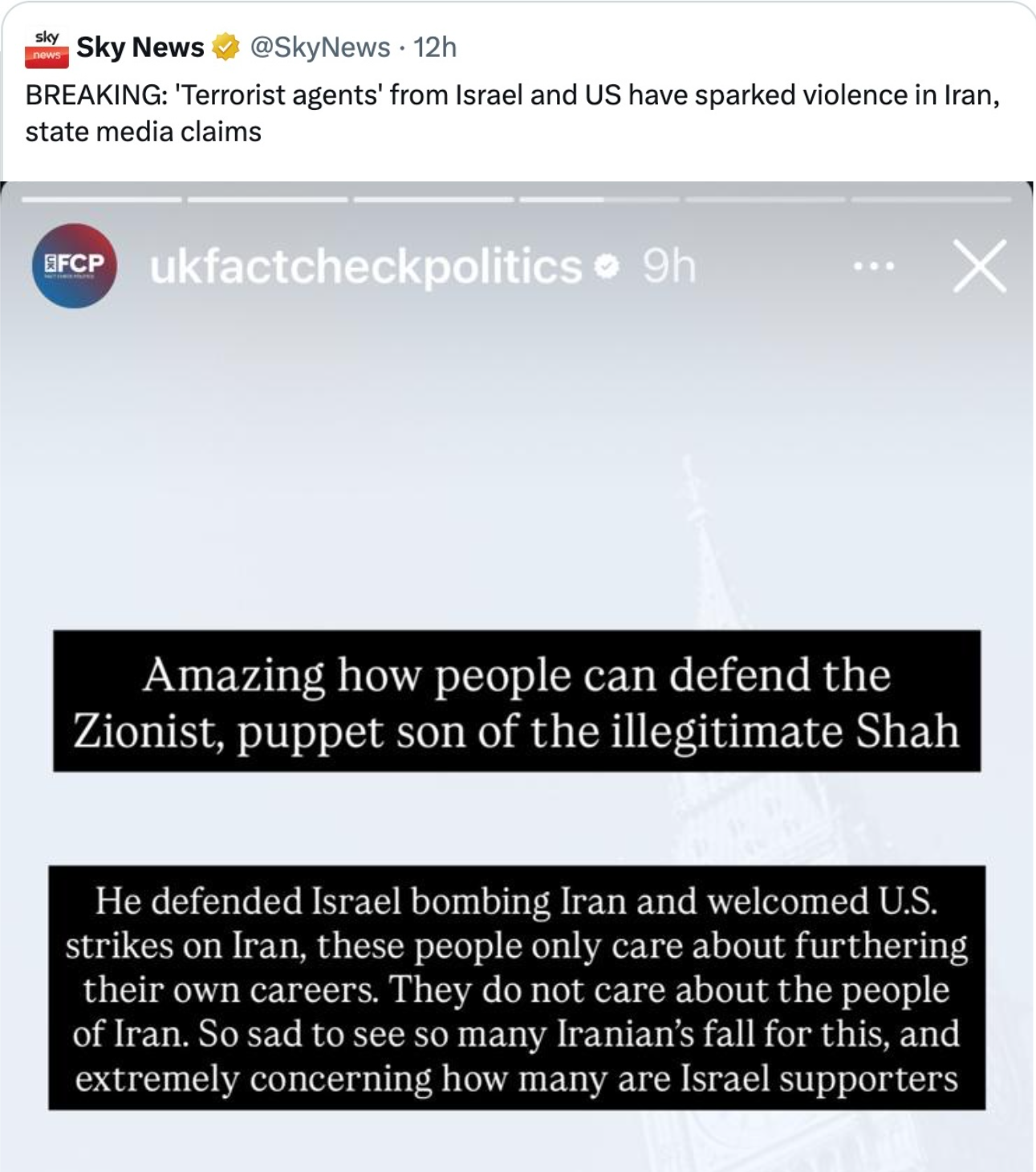 And yet the reflexive response of so much of the Western liberal information ecosystem has been to delegitimise the counter-revolution by inserting their own neuroses regarding Israel, America, and the West, into the situation. This “Just Asking Questions” fallacy strips the Iranian people of their agency in this moment, framing this counter-revolution as a result of “Zionist” or American agitation, with Sky News parroting the regime’s party line without hesitation, or, as UK “Fact Check” Politics put it (an ironic title if ever there was one), a desire to get a “Zionist puppet” in Reza Pahlavi back in power. If you needed to understand the “anti-imperialism” of idiots in action, this is it.