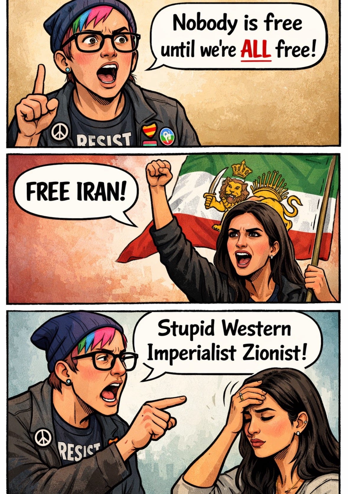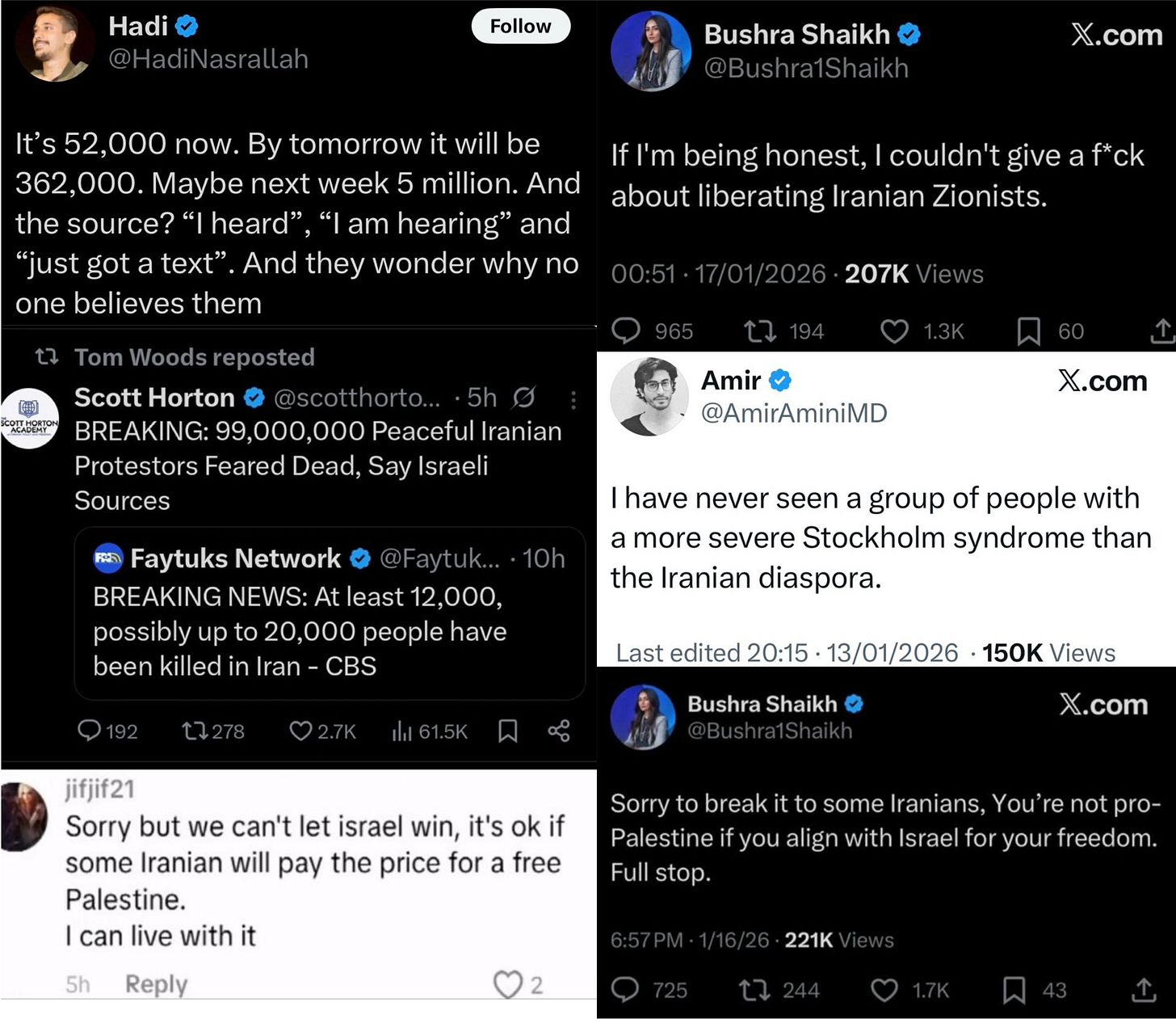 Comfortable comment-section-bottom-feeders, the very people who, for two years, questioned nothing coming out of Gaza, suddenly question the voices and motives of those in Iran and in the diaspora. Perhaps more than anything, it is tragically clear how far too many people would rather see the Islamic Republic remain and, whether they say this quiet part out loud or not, see Iranians slaughtered by their government, than Israel or America have any hand in aiding the protestors in bringing down the regime. It takes a particular form of moral narcissism, a distant moral indulgence, to view the suffering and death of the Iranian people under brutal theocracy through one’s own sense of self-righteousness, irrespective of the consequences for the people in question. To quote Leila Al-Sharma: