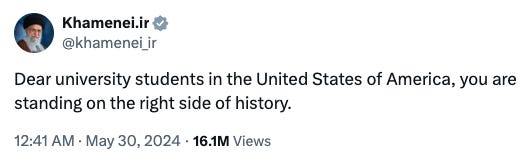 But this view of the Islamic Republic is now somewhat historic, and does not explain the conspicuous absence of outrage directed at the Islamic Republic either during the current protests, or with any of the several instances of civil unrest in Iran during the past few years. In fact, the Western Left has found itself repeatedly on the side of the Islamic Republic in recent years, primarily under the banner of Free Palestine. This is a predictable downstream consequence of the Anti-Imperialism of Idiots. To quote the Syrian activist Leila Al-Shami, the “Anti-Imperialism of Idiots” is an ideology that: